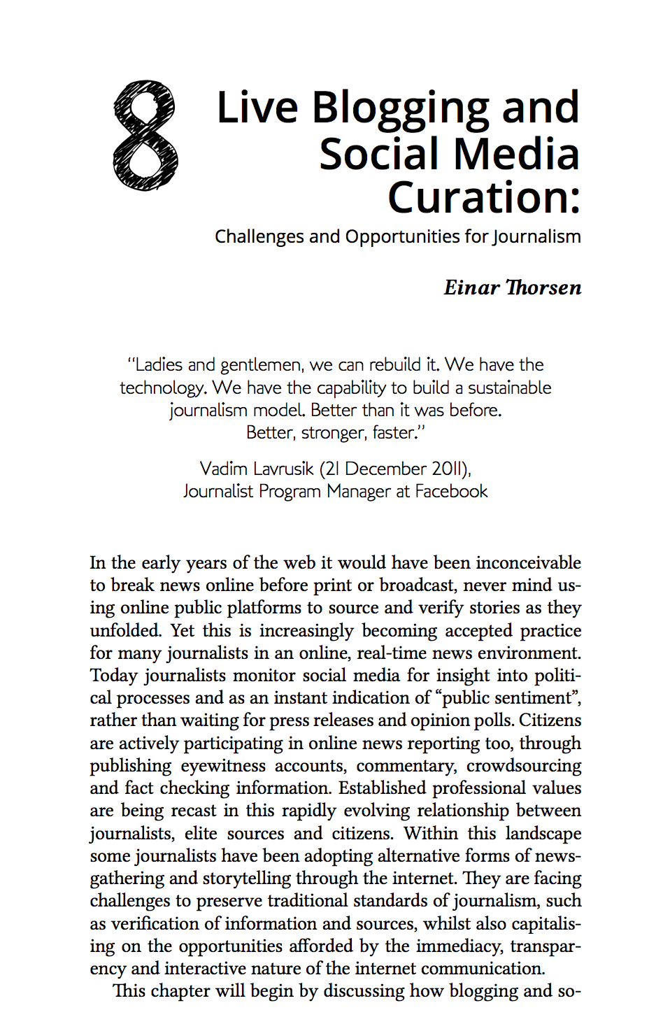 Thorsen, E. (2013) ‘Live Blogging and Social Media Curation: Challenges and Opportunities for Journalism‘, in Fowler-Watt, K. and Allan, S. (eds) Journalism: New Challenges, Centre for Journalism & Communication Research [Full chapter PDF] |