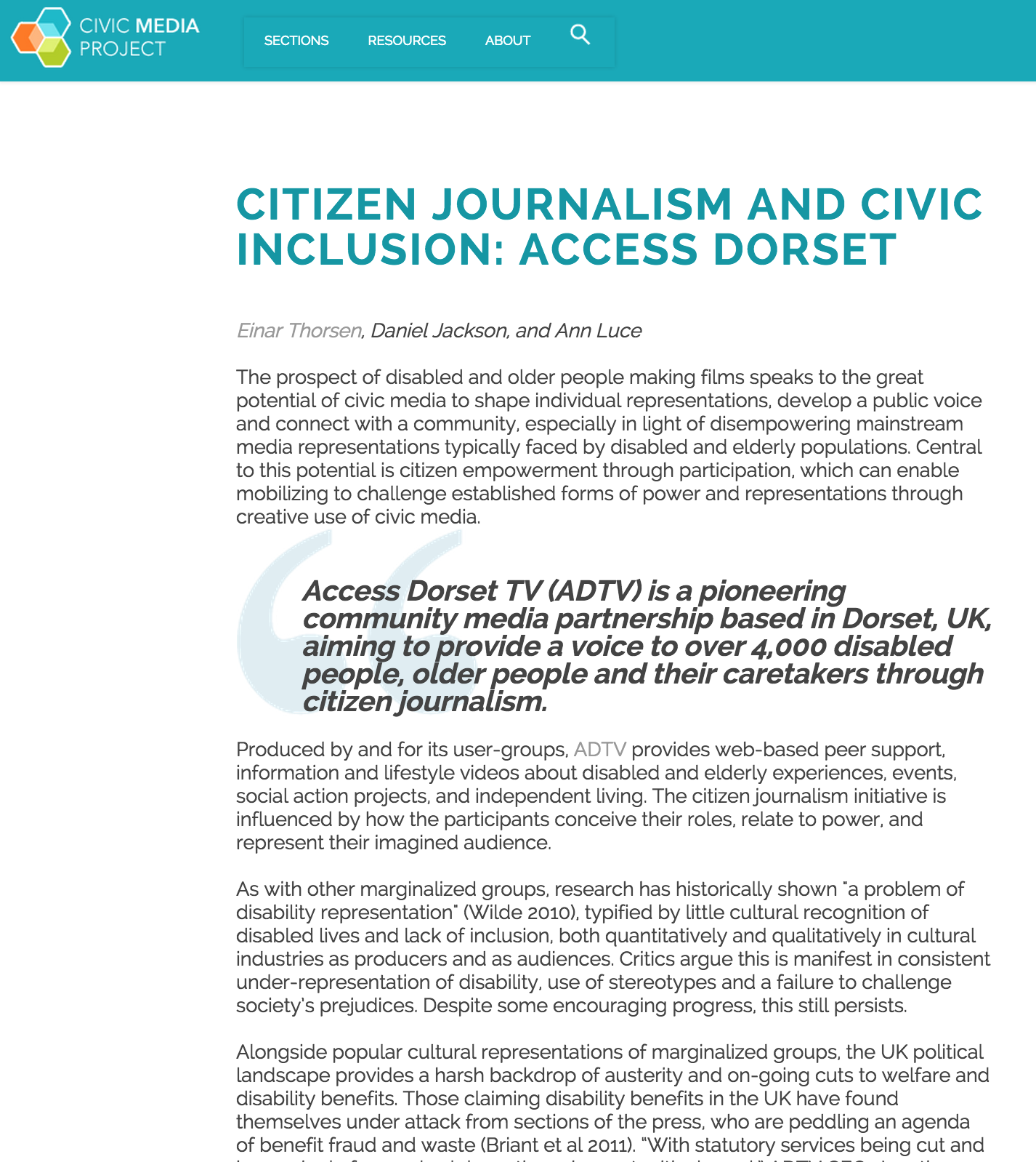 Thorsen, E., Jackson, D., and Luce, A. (2015) ‘Citizen journalism and civic inclusion: Access Dorset’, in Gordon, E. and Mihailidis, P. (eds) The Civic Media Reader, MIT Press [online version] |