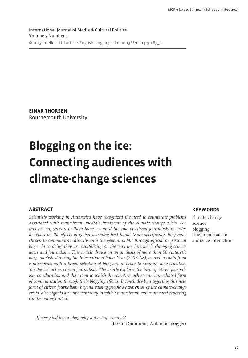 Thorsen, E. (2013) ‘Blogging on the ice: connecting audiences with climate-change sciences’, International Journal of Media and Cultural Politics, Vol. 9, No. 1, pp. 87-101 [Publisher] |