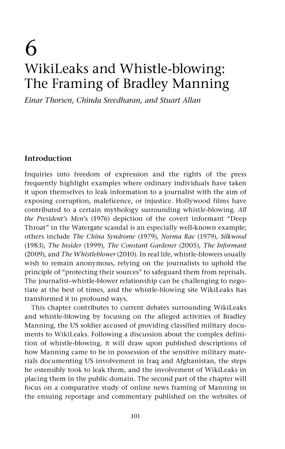 Thorsen, E. (2017) ‘Whistleblowing in a Digital Age: journalism after Manning and Snowden’, in Franklin, B. and Eldridge, S. A. (eds) The Routledge Companion to Digital Journalism Studies, Routledge: Oxon and New York [