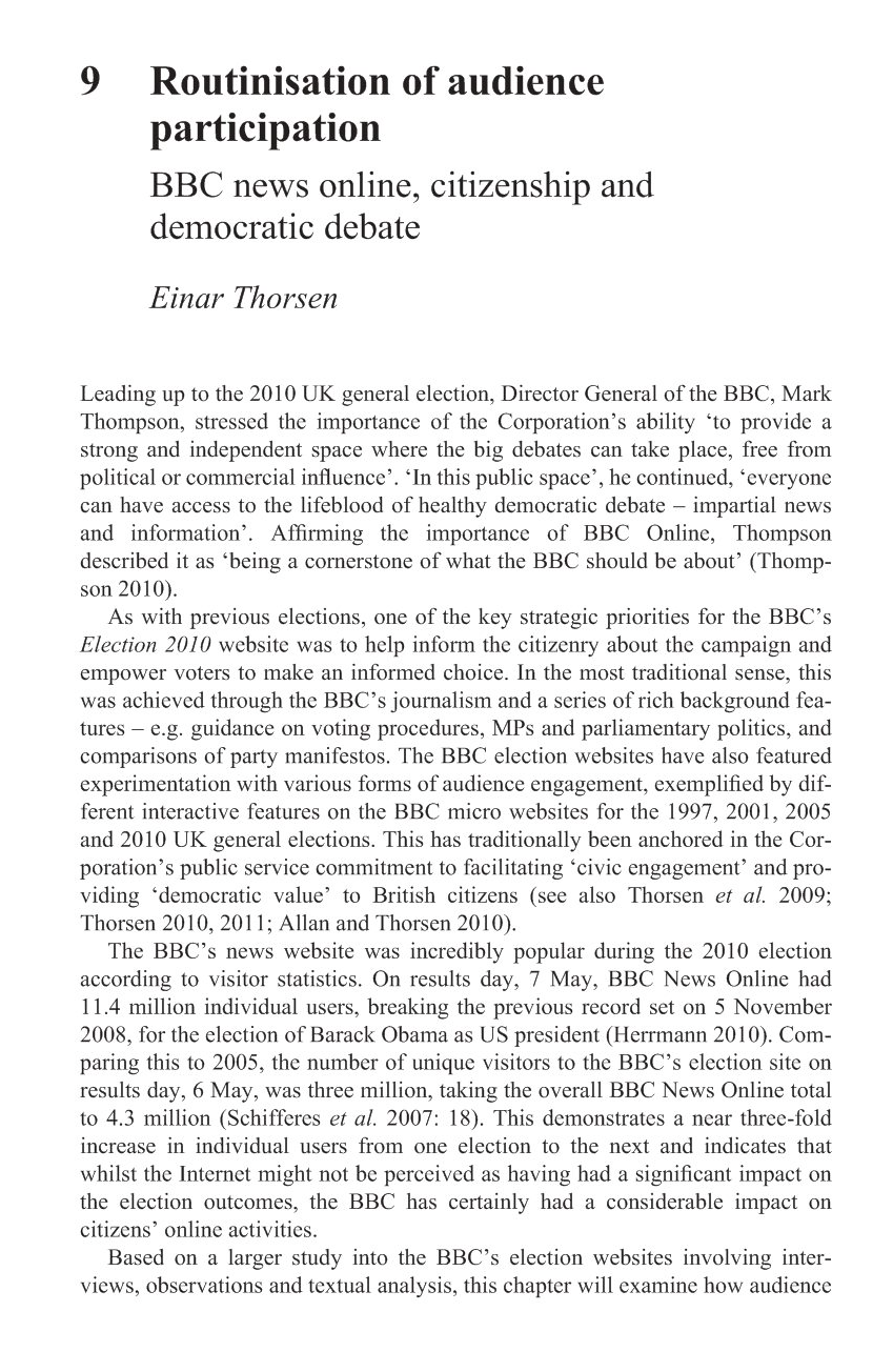 Thorsen, E. (2013) ‘Routinisation of Audience Participation: BBC News Online, Citizenship and Democratic Debate‘, in R. Scullion, R. Gerodimos, D. Jackson, D. Lilleker (eds) The Media, Political Participation and Empowerment, Routledge [Publisher] |