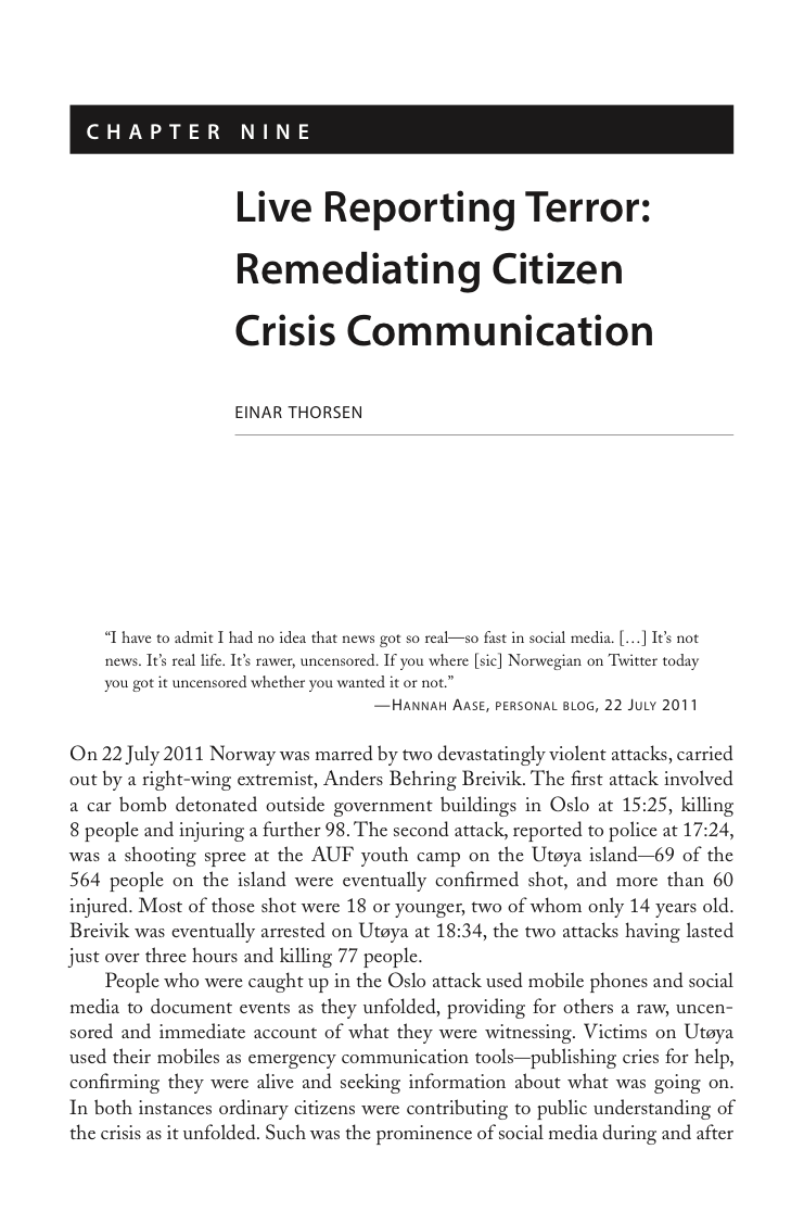 Thorsen, E. (2014) ‘Live reporting terror: remediating citizen crisis communication‘, in Thorsen, E. and Allan, S. (eds) (2014) Citizen Journalism: Global Perspectives, Volume Two, Peter Lang Publishing: New York |