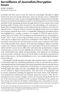 Thorsen, E. (2019) ‘Surveillance of Journalists / Encryption Issues‘, in Vos, T. P. and Hanusch, F. (eds) International Encyclopedia of Journalism Studies, Wiley Blackwell [